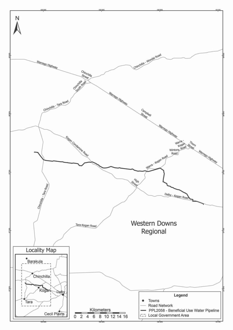 The application relates to the construction and operation of a water transmission pipeline (59 km in length). Activities are proposed to occur in the area of Kogan and within the boundaries of blocks and sub blocks BRIS 2526 (H, J, K, N, O, P, T, U, Y, Z), 2527 (F, G, H, L, M, N, O, P, Q, R, S, T, U, V, W, X, Y, Z), 2528 (L, M, N, O, P, Q, R, S, T, U, V, W, X, Y, Z), 2529 (Q, R, S, T, U, V, W, X, Y, Z), 2530 (Q, R, S, T, U, V, W, X, Y, Z), 2531 (Q, R, V, W, X), 2600 (A, B, C, D, E), 2601 (A, B, C, D, E, F, G, H, J, K), 2602 (A, B, C, D, E, F, G, H, J, K), 2603 (A, B, C, D, F, G, H, J, K, M, N, O, P, S, T, U, Y, Z), 2604 (L, Q, R, V, W, X), 2675 (E) and 2676 (A, B, C, D, F, G, H) as defined in the Queensland Block Identification Map Series B.